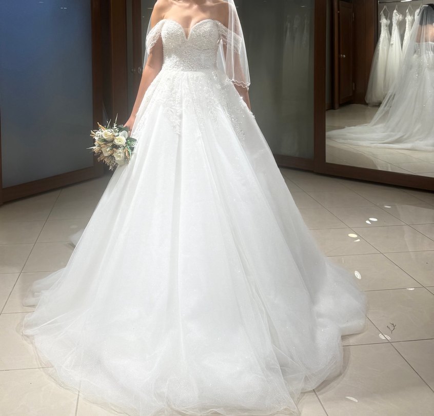 Straplez, uzun beyaz gelinlik; gevşek A kesim, ince askılı kollar ve modern klasik detaylarla göz alıcı bir şıklık sunar. Defosu yoktur bir kez giyildi