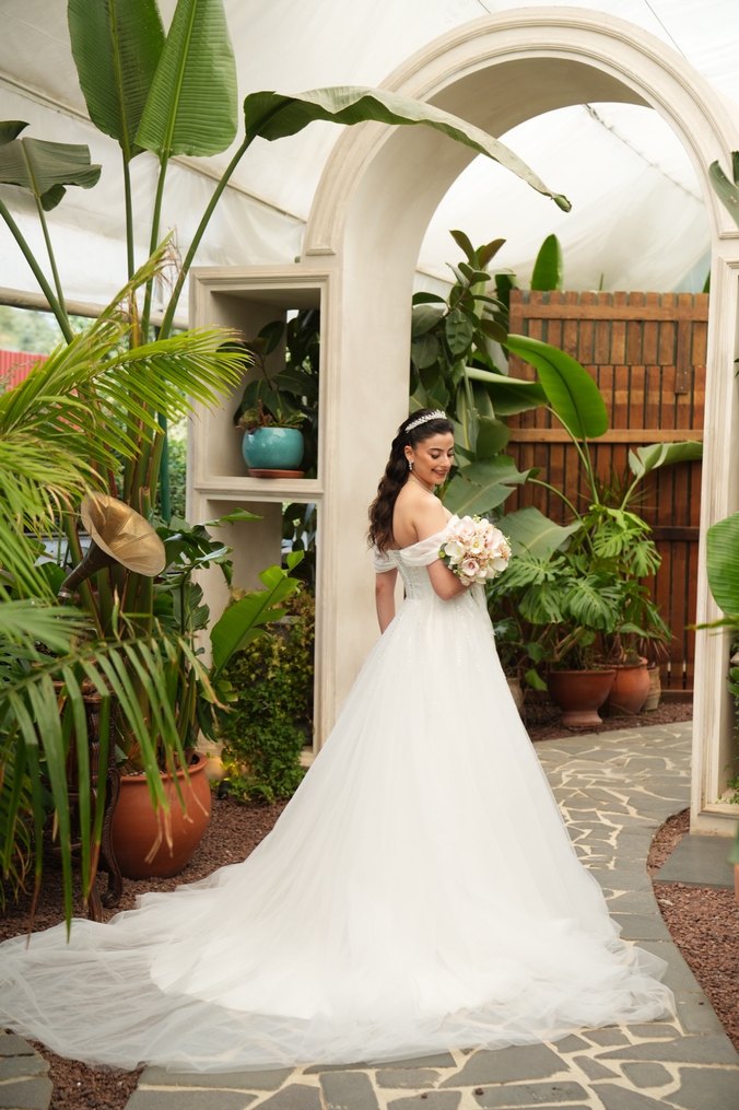 Straplez, uzun boy, askılı kollu, bol kesim, klasik ve minimalist tasarımlı beyaz A kesim gelinlik.