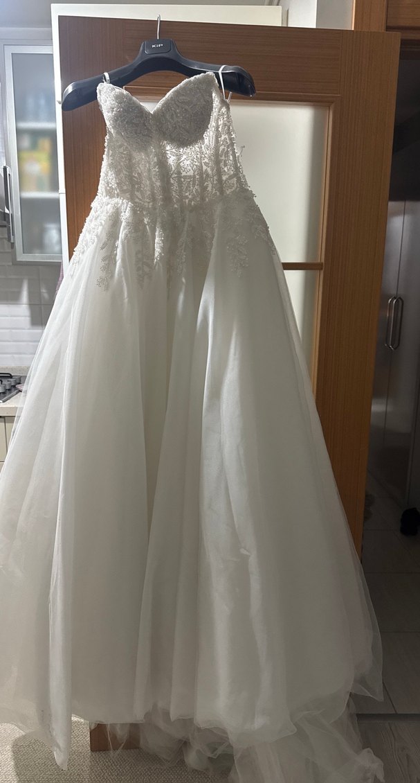 Bu beyaz A kesim gelinlik, straplez yakalı ve ince askılı, vücuda oturan bir üst kısma sahiptir. Modern klasik tarzda, uzun ve akıcı etekli, minimal şıklık sunar.