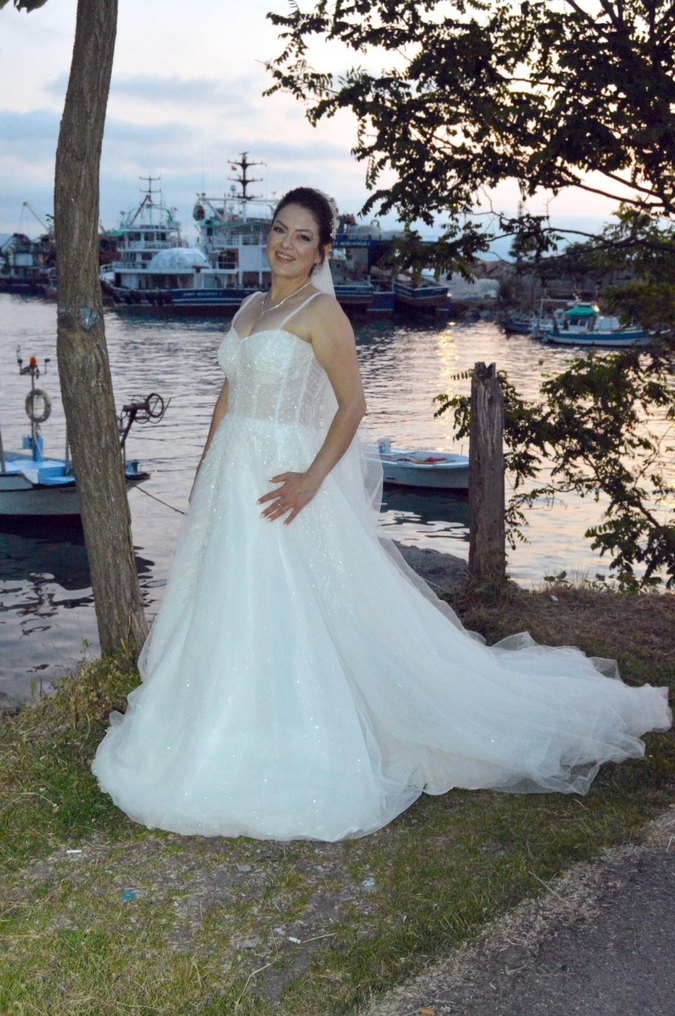 Beyaz renkli, straplez yaka ve uzun etekli A kesim gelinlik. Klasik ve gösterişli tarzda, kolsuz ve vücuda oturan model.167 boy 56 kilo göğüs 85 beden