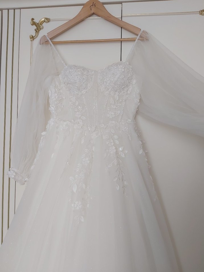 Uzun beyaz gelinlik, straplez yaka ve ince askılı kollara sahip. Modern klasik tarzda, vintage çiçek detaylarıyla şık ve zarif bir görünüm sunar. ölçüleri :Bel 67 dış kısımdan olculdugunde. Boy 166 Arka uzunluk 206 cm Duvak 255 cm