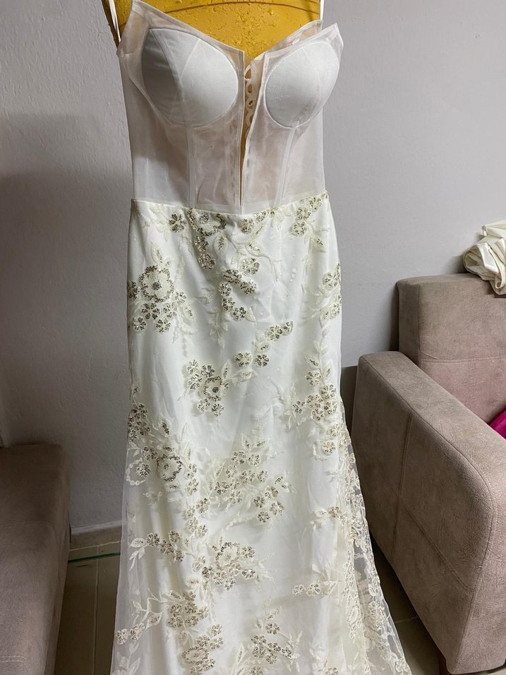 Uzun, straplez ve kolsuz olan bu fitted A kesim gelinlik, vintage çiçek işlemeleri ve bohem tarzı ile şık bir görünüm sunar.