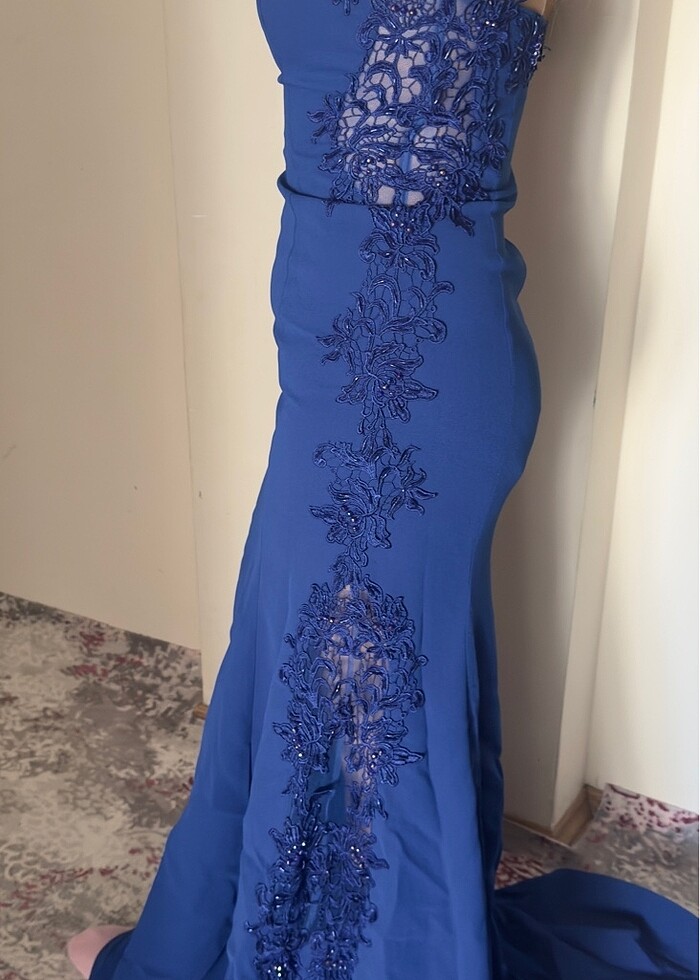 Elbise bir kez giyilmiştir. Kuru temizleme yapılmamıştır. 55 kilo giyilmiştir. Straplezdir. Çok hoş transparan dantel işlemeleri vardır Parlement mavidir. Fiyatı ona göre ayarlanmıştır. Hiçbir kusuru yoktur.