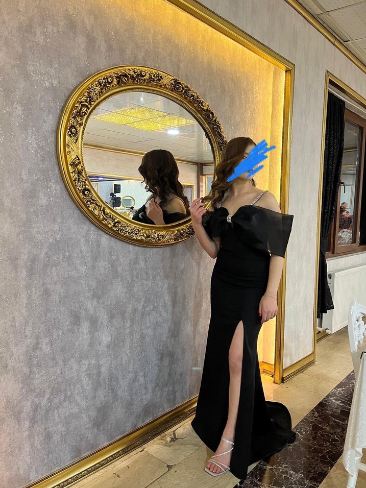 , siyah rbüyük fiyonk detaylı, ince askılı, vücuda oturan uzun abiye elbise. Arkada kısa kuyruklu yırtmaçlı✨