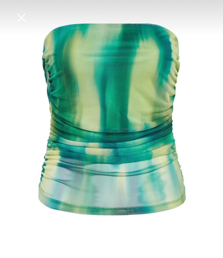 çok renkli tie-dye desenli, straplez ve astarlı tasarıma sahip sentetik kumaştan yapılmış, oturan ve çağdaş stile sahip atlet.