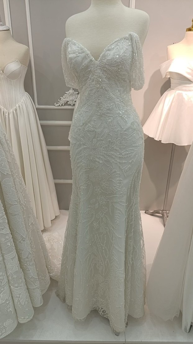 Straplez, uzun balık gelinlik, detaylı boncuk işlemeleriyle modern klasik tarzda. Kolsuz ve regular fit, bej ve gri tonlarında, gösterişli bir şıklık sunar.