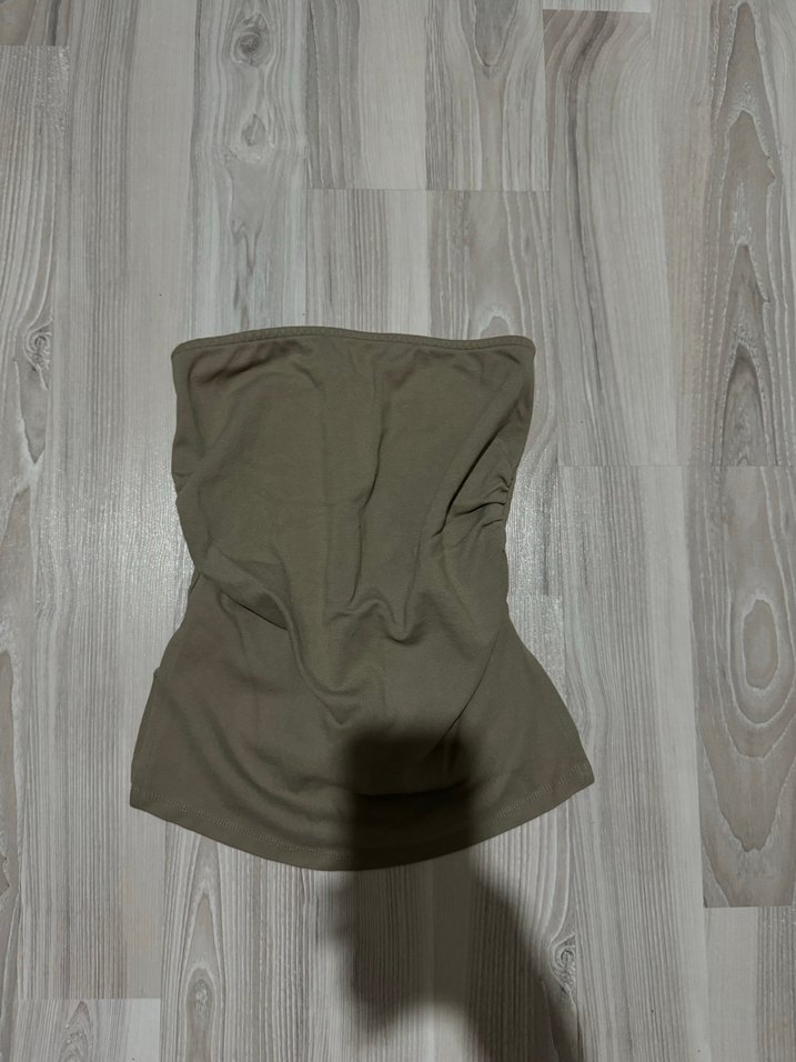 Bej renkli, straplez ve kolsuz, vücuda oturan düz yüzeyli kadın büstiyer. Sokak modasına uygun minimal ve şık bir tasarım.