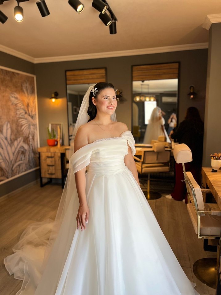 Straplez yakalı, omuzları açık askılı, beyaz A kesim gelinlik. Uzun boy ve klasik modern, minimalist tarzda düzenli kesimle tasarlanmıştır.