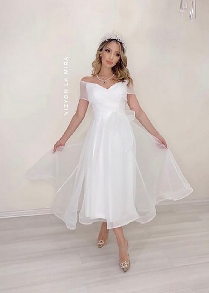 Beyaz A kesim uzun gelinlik, straplez yaka ve ince askılarla. Modern klasik tarzda, hafif ve zarif kumaşla, rahat kesim sunar.