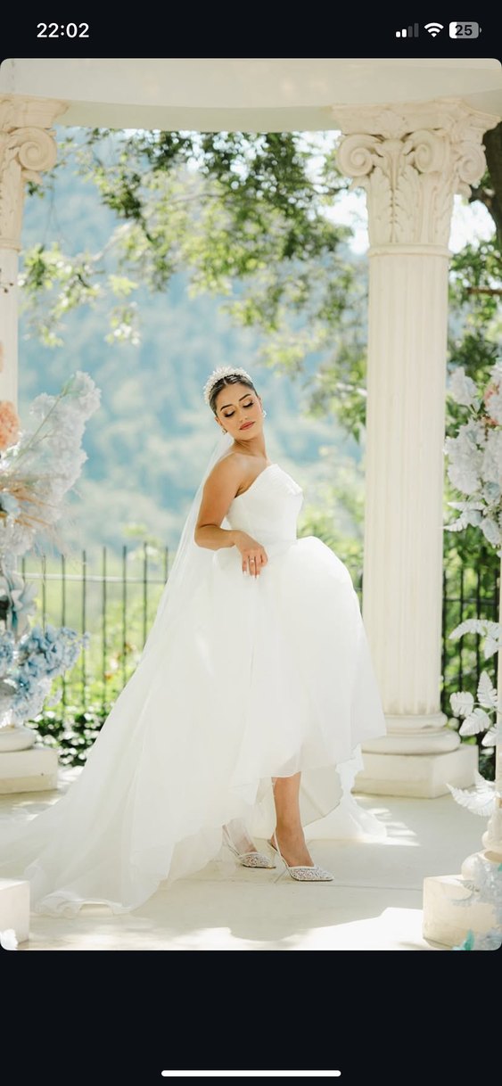 Uzun beyaz A kesim gelinlik, straplez yaka ve ince askılı kollarla modern klasik tarzda, rahat kesim sunar. Minimalist şıklık için idealdir. Herhangi bir sorun yoktur gelinliğimde 38 bedene kadar uyumludur Gelinlik tacı ile beraber verilecektir