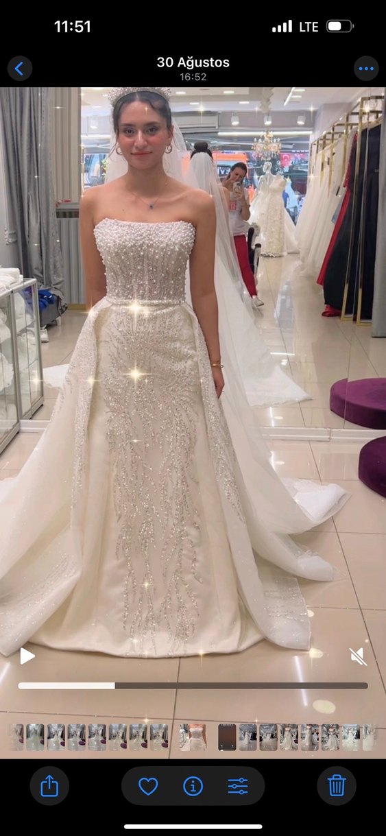 Straplez beyaz gelinlik, işlemeli detaylar ve uzun A kesim etek ile modern klasik şıklığı yansıtıyor. Demonteli ve eldiven duvak dahil hiç giyilmedi .35.000₺