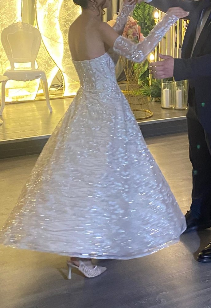 Straplez beyaz nişanlık, vücuda oturan üst kısmı ve hafif ışıltılı A kesim uzun etekle dikkat çekiyor. İnce askılı uzun kollara sahip, klasik ve zarif bir tasarım. Bolerosu vardır. 1 kere giyilmiştir.Defosu yoktur. özel dikimdir. Beden ölçüleri için iletişime geçebilirsiniz.