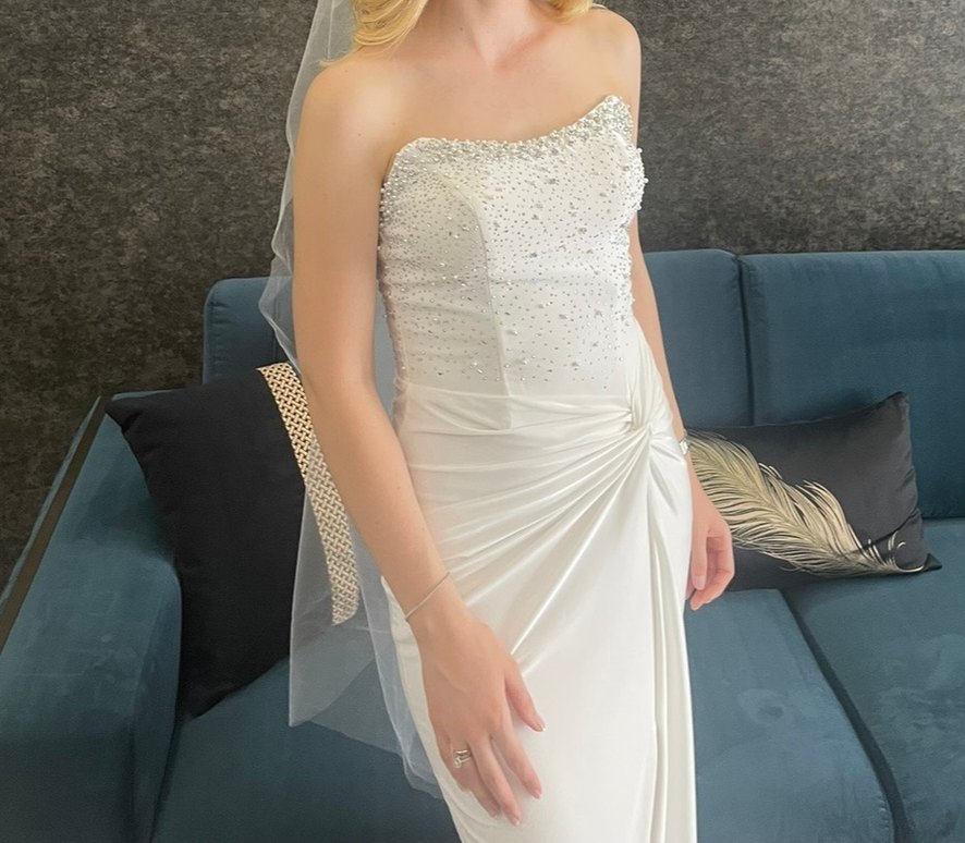 Beyaz straplez denizkızı gelinlik, vücuda oturan kesim ve kolsuz tasarıma sahiptir. Üst kısmı hafif ışıltılı detaylarla süslenmiş, eteği zarif drapeler içerir. Çağdaş ve göz alıcı bir stil sunar.