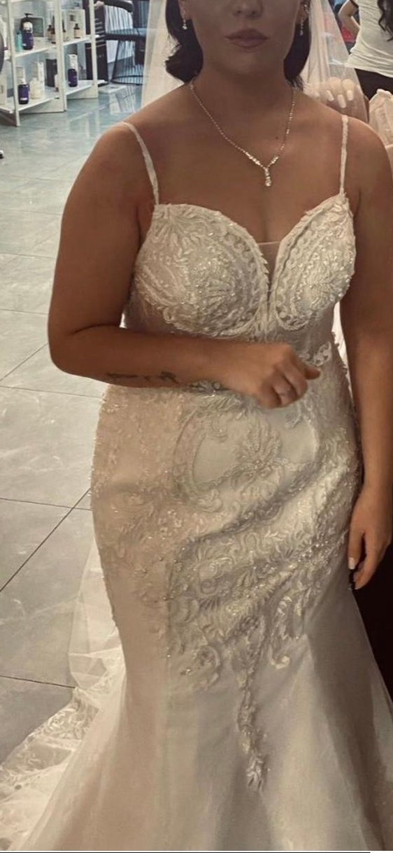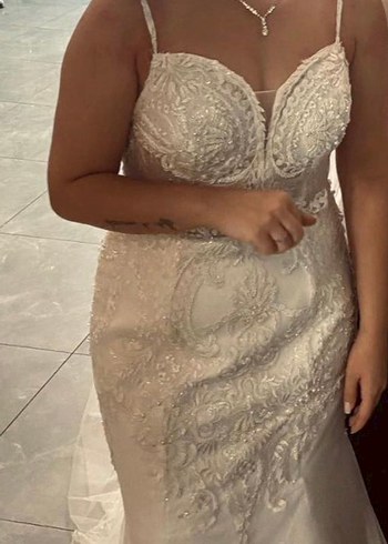Özel dikim balık model gelinlik, 38-40 beden. Arkası ipli, etek kısmı elastan, oturup kalkarken ve dans ederken çok rahat. Fransız lezzinden dikilen kaliteli kumaştır, tarlatan ve duvak hediye. • Durum: Sadece bir kere düğünümde giyildi • Tadilat / yırtık: Hiçbir yırtık, sökük veya tadilat gerektiren durum yok • Temiz ve özenle korundu