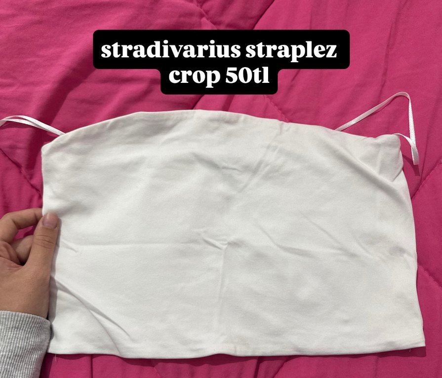 Stradivarius markalı, beyaz, elastik detaylı, straplez crop üst. Düz ve günlük kullanıma uygun, vücuda oturan kesim.