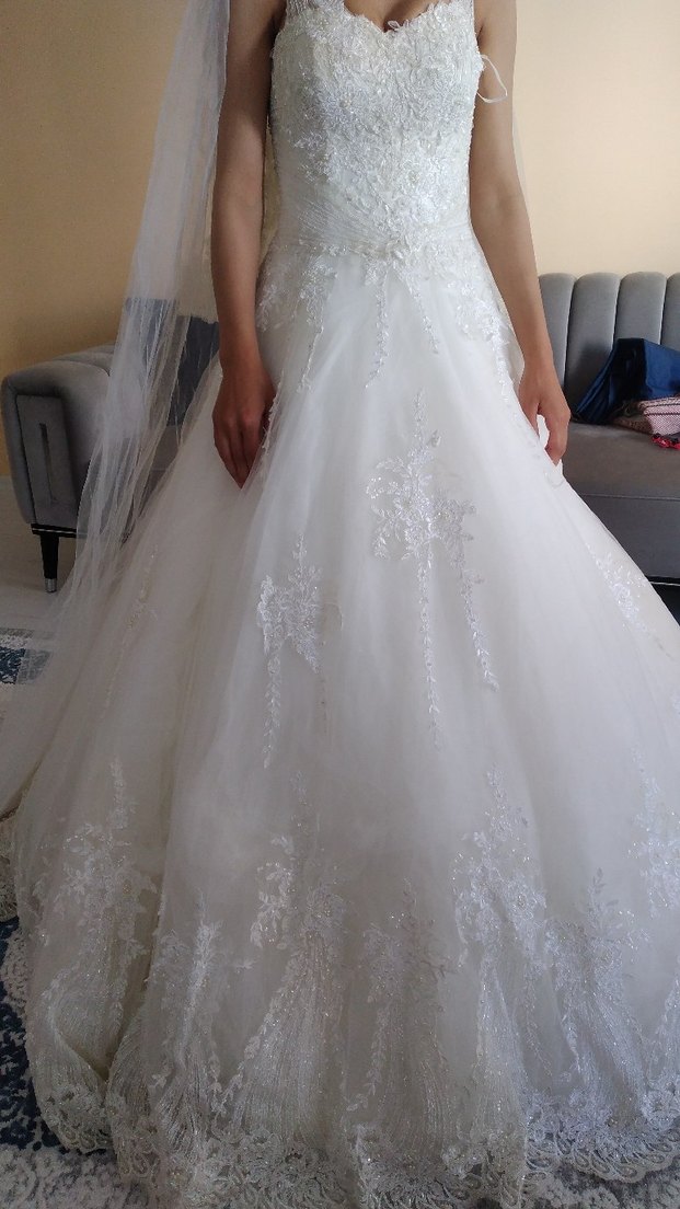 Straplez yakalı, dantel detaylı beyaz prenses gelinlik. Uzun etek ve ince askılı kollarıyla klasik şıklığı yansıtıyor. üstünde duağı ve kendi duağıda mevcut