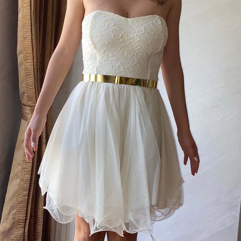 Straplez, dantel işlemeli beyaz tüllü elbise. Mini gelinlik veya mezuniyet elbisesi olarak kullanılabilir. Altın kemeri ayrı bir parça çıkartılabilir. Biraz elbise dolapta durduğu için sararmış durumda ama tek yıkamayla hallolur