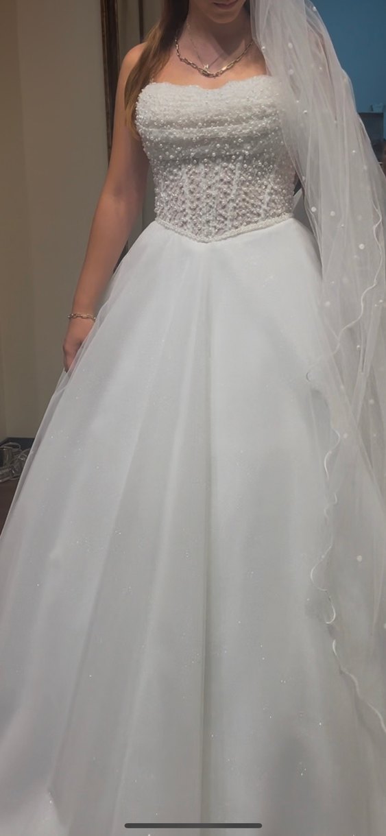 Bu beyaz gelinlik, zarif boncuk işlemeli straplez ve vücuda oturan üst kısmı ile uzun, dökümlü A kesim eteğe sahiptir. Klasik ve şık bir siluet sunar. İnci ip askılıdır. Boy 157 kilo 49. Arkası ipli olduğu için bedene göre ayarlanabilir.