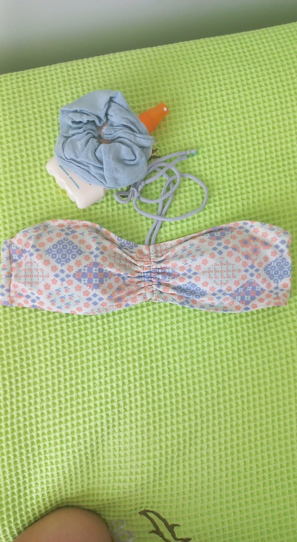 Pastel renklerde, çok renkli bağlamalı bikini üstü, yumuşak dokulu ve ortada büzgülü detaylıdır. s beden