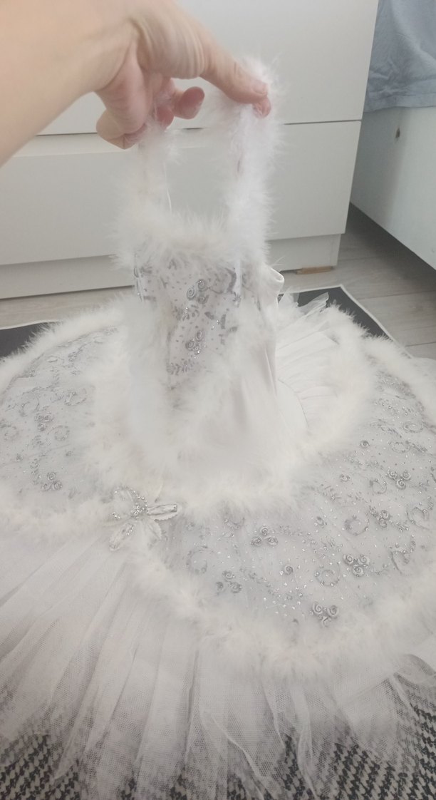 Beyaz gelinlik, straplez ve ince askılı, vücuda oturan kesime sahip. Bohem ve avangart tarzı, gümüş detaylar ve yumuşak tüy süslemelerle tamamlanmış. Moda tutkunları için ideal.