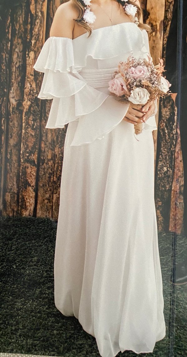 Uzun beyaz gelinlik, straplez yaka beyaz elbise Sadece dış çekimde kullandım İçerisine ekstra bir kat daha astar diktirdim Hiçbir problemi yok