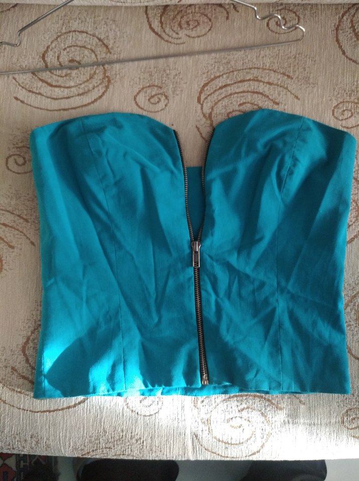 Rengi yeşil fotoğrafta mavi çıkıyor .önden fermuarlı straplez büstiyer. Vücuda oturan kesimi ve midi boyu ile cesur parti kombinlerine uygun.