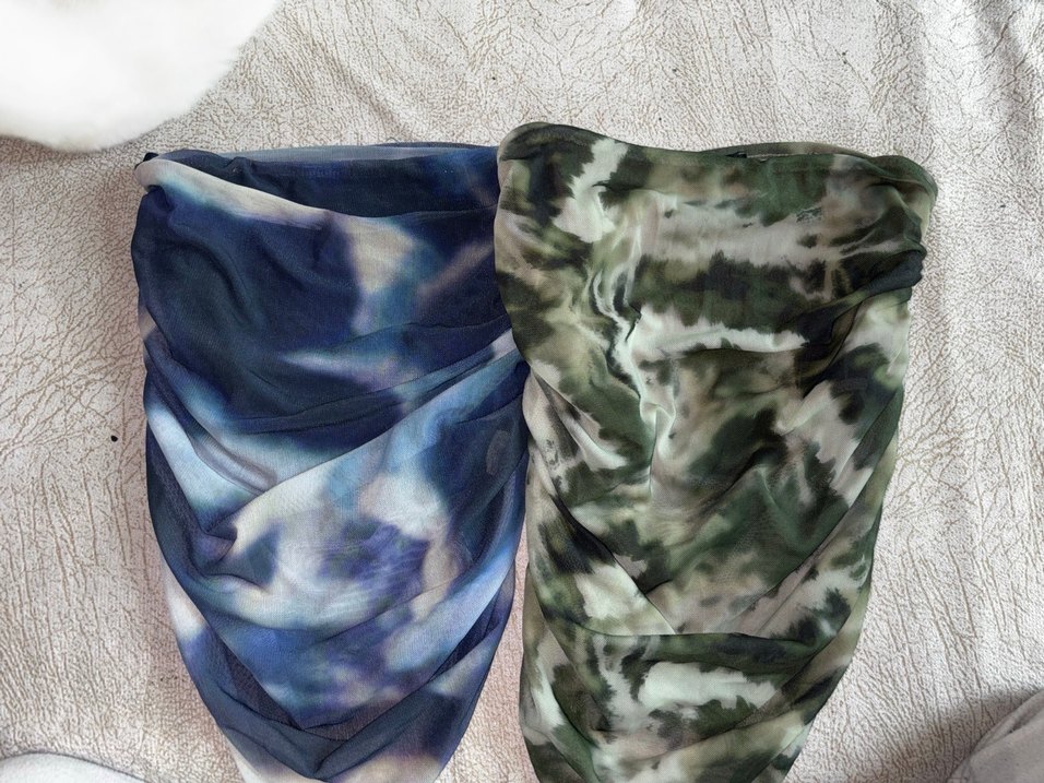 Yumuşak sentetik kumaştan drapeli kadıncrop , mavi ve yeşil tonlarında, çağdaş avant-garde tarzında. Moda tutkunları için ideal.