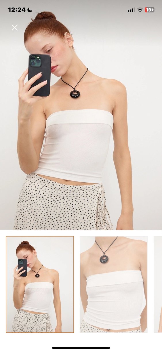 Beyaz straplez, midi boy, vücuda oturan ve desensiz hamile üstü. Hafif ve sade tasarıma sahiptir.