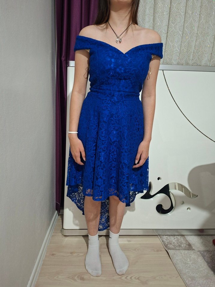 Lacivert dantelli, straplez yaka ve ince askılı, vücuda oturan midi abiye elbise, gotik tarzda parti için uygundur. 36 38 BEDENE UYGUNDUR