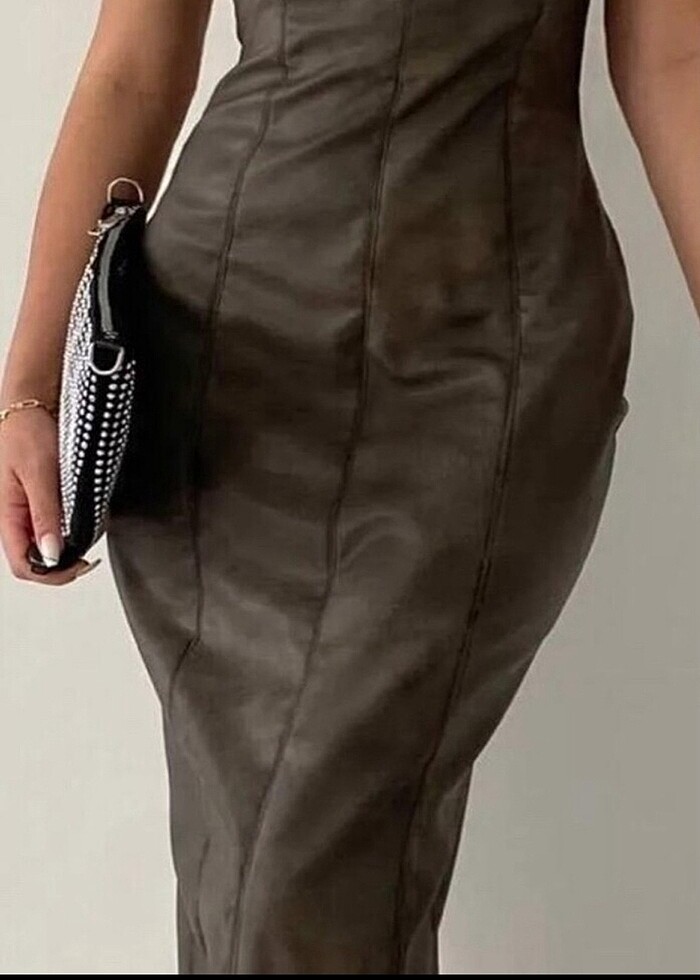 38 beden (s-m ile uyumlu), 1-2 defa kullanılmış, straplez arkası yırtmaçlı haki deri midi elbise