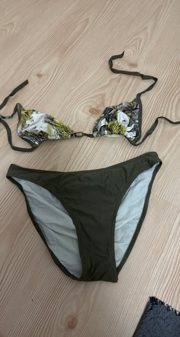 Desenli, ince askılı üst ve düz khaki renkli bikini altından oluşan, vücuda oturan şık bir plaj bikini seti.