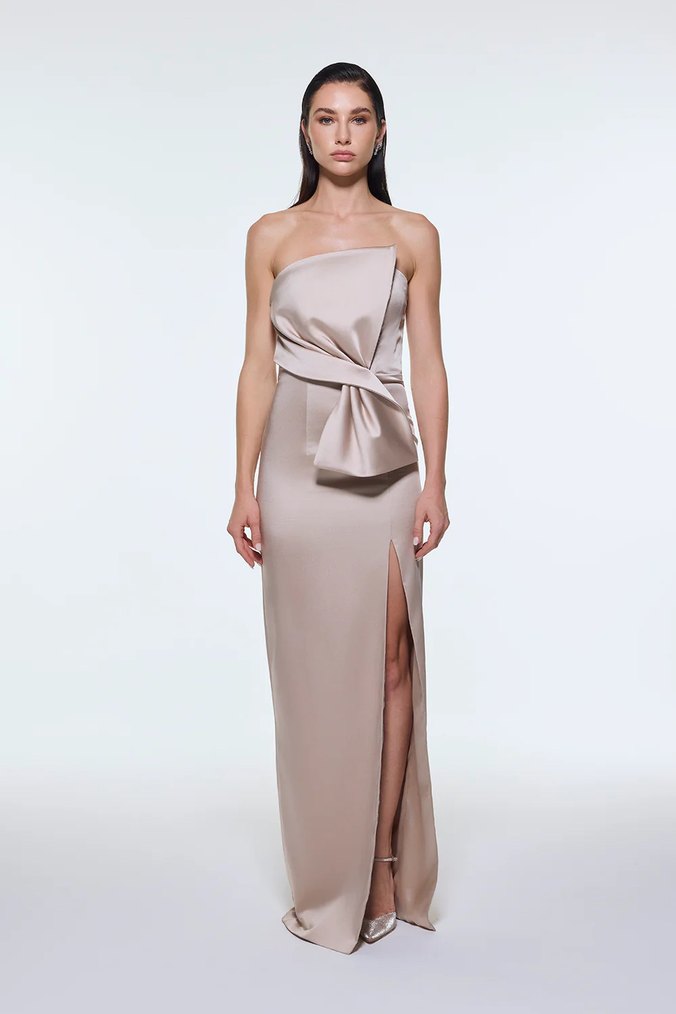 Bej renkli bu uzun abiye elbise, straplez yakaya ve belde drapeli detaya sahiptir. Strappy kollu, düzenli kesim ve yırtmaçlıdır, düğün için uygundur. ✨