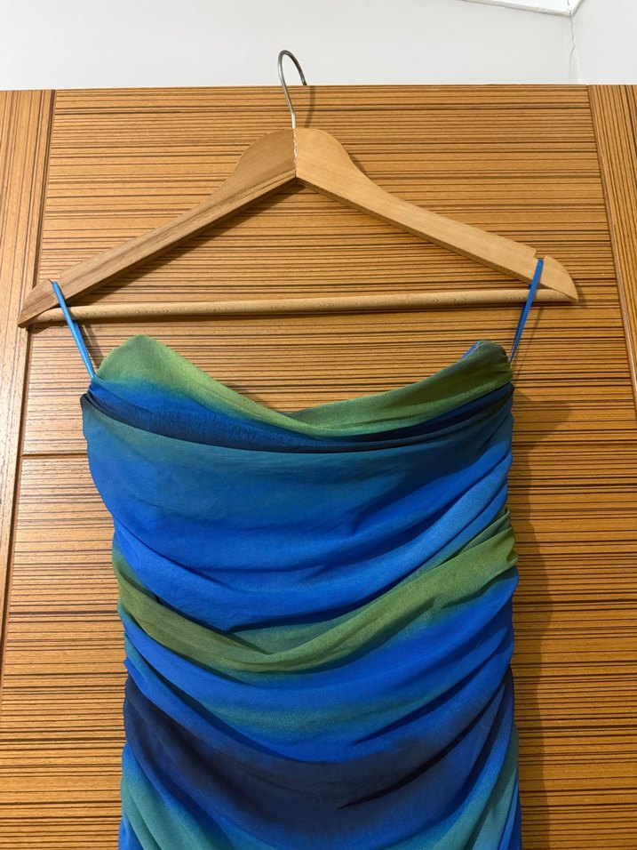 Drapeli, straplez ve uzun kesime sahip bu elbise, koyu mavi ve yeşil tonlarında batik desenlidir. Bohem parti tarzı için uygundur.