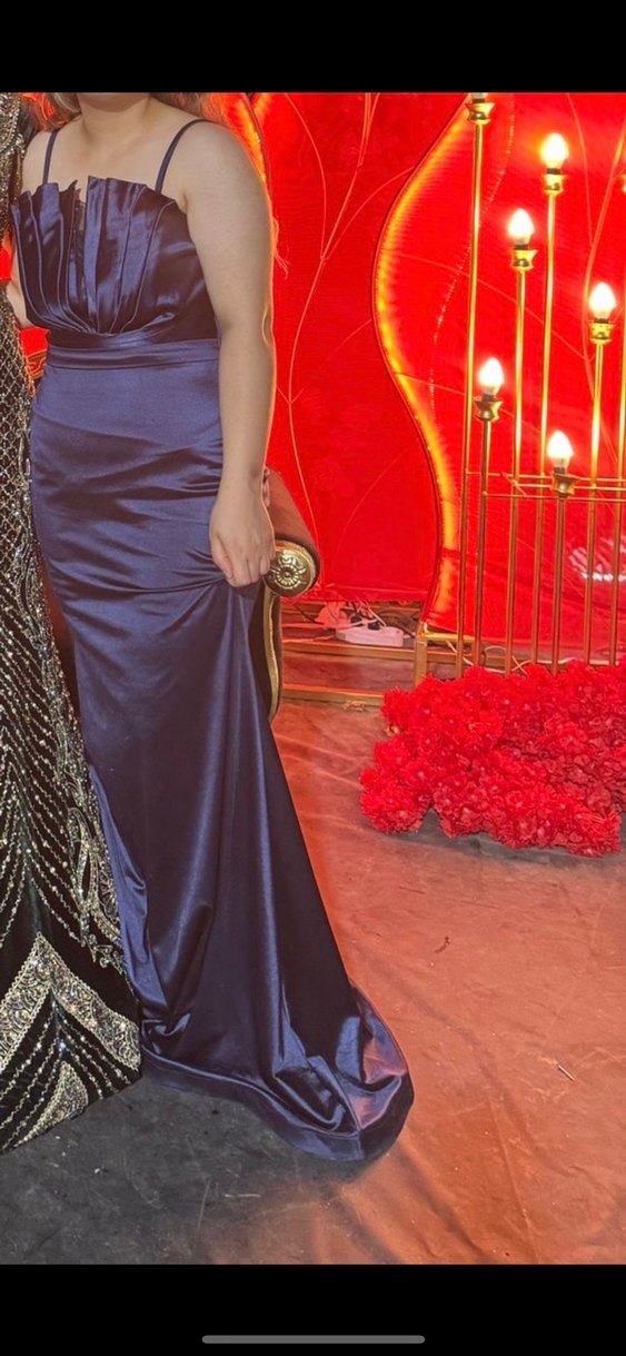 Lacivert renkli, straplez yakalı, drapeli ve uzun kesimli abiye elbise. İnce askılı ve bağlama desenli modern tasarım, düğünler için uygun.
