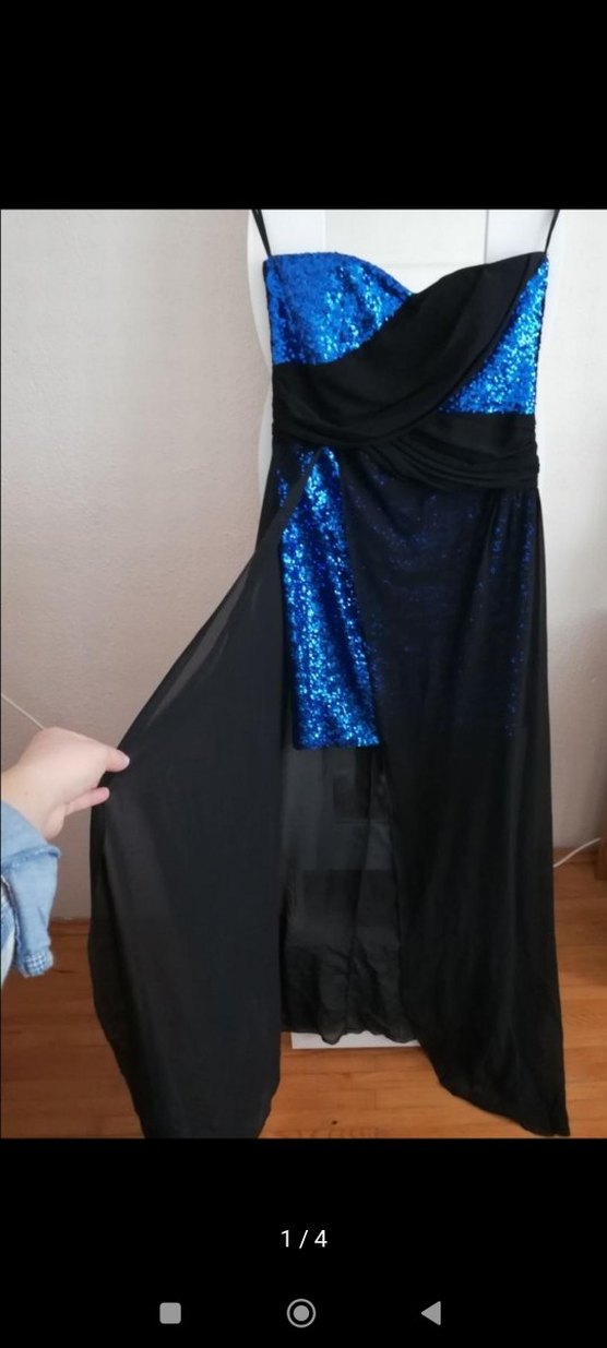 Dar kesim, straplez abiye elbise, koyu mavi payetli üst kısmı ve siyah drapeli detaylarıyla partiler için göz alıcı goth tarzı sunar. ✨