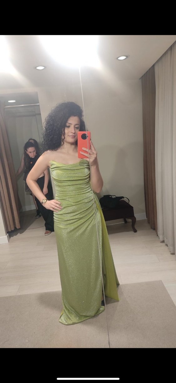 Parlak haki renkte, straplez ve drapeli uzun abiye elbise. Üstü korse altta yırtmacı bulunmakta ve uzun bir kuşak detayı var çok şık bir abiye