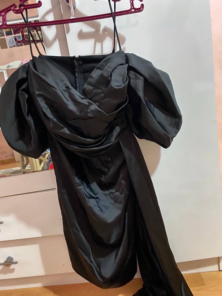Drapeli tasarıma sahip, straplez yaka ve askılı kollu, uzun siyah gotik abiye elbise. Parti için avant-garde tarzda şık bir seçim saten elbise