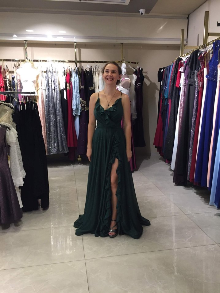 Koyu yeşil, straplez, vücuda oturan uzun abiye elbise. Drapeli detaylara ve ince askılara sahiptir. Düğün ve özel davetler için uygundur.