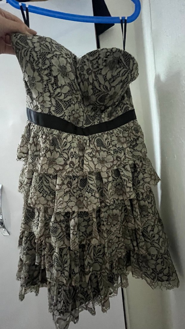 Bu straplez, vücuda oturan elbise, katmanlı fırfırlar ve siyah bel kemeri ile desenli bej ve gri kumaşa sahiptir, parti için uygundur.