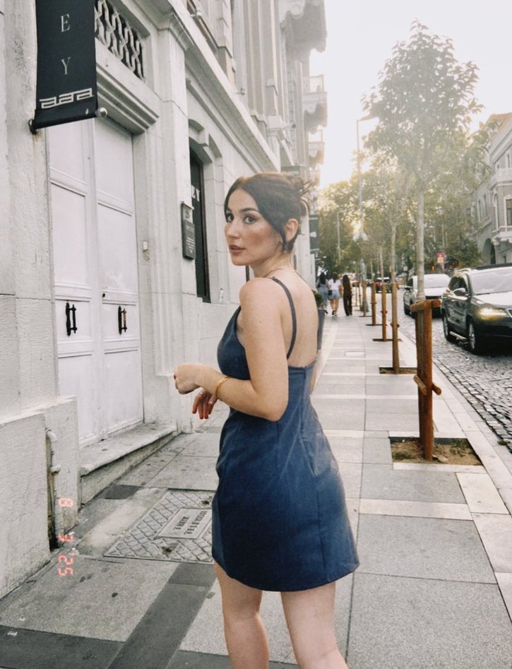 Gri mini elbise, straplez yakalı ve drapeli detaylı. İnce askılı, Paris tarzı ve romantik akşamlar için uygun.