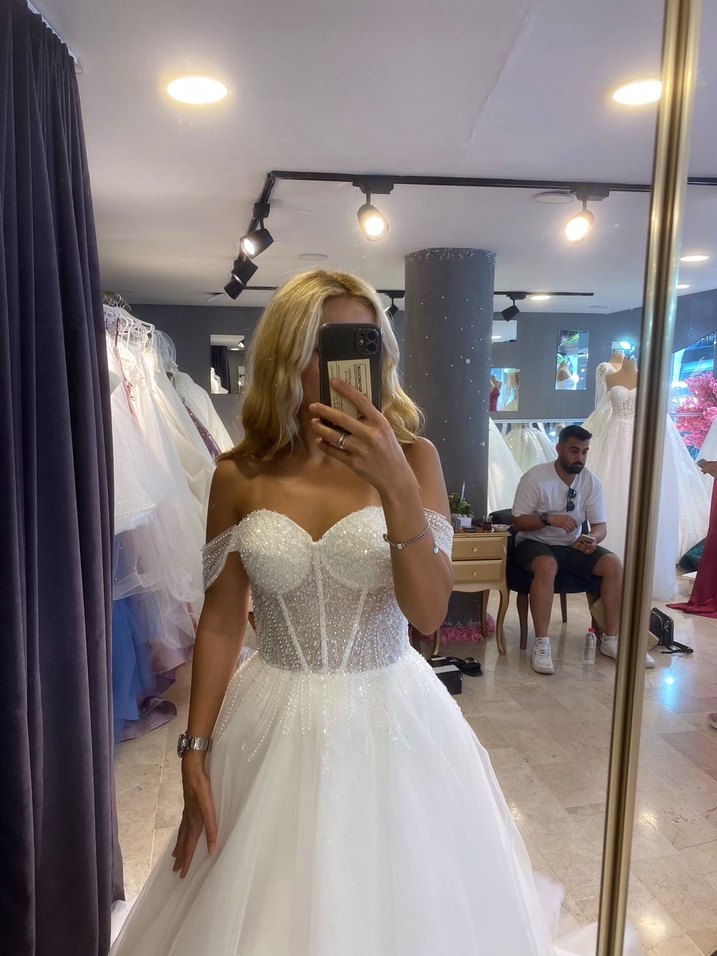 Beyaz, straplez yaka ve ince askılı kollarıyla, klasik zarafet ve bohem tarzı bir araya getiren, helen kesim, taşlı gelinlik.