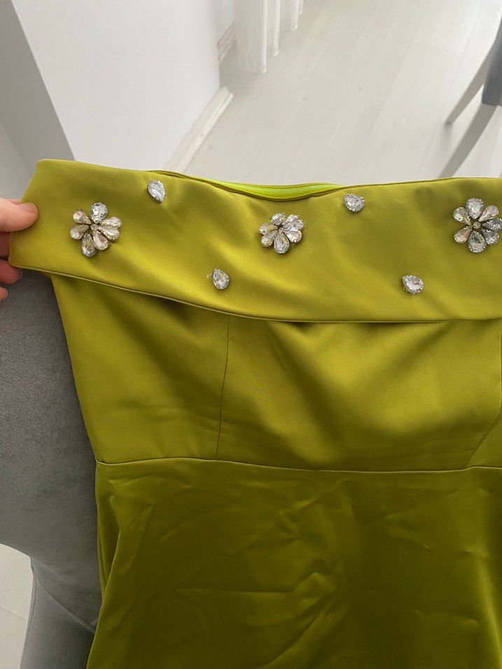 Bu yeşil straplez midi abiye elbise, işlemeli çiçek detayları ve düğme süslemeleriyle parlak kumaştan yapılmıştır, düğünler için uygundur. Bir kere kullandım çok şık bi ürün M-L uyumlu