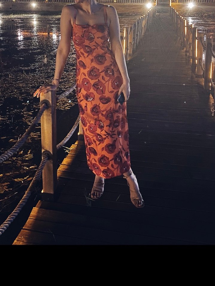 İpeksi kumaştan, straplez yaka ve drapeli tasarıma sahip, kahverengi tonlarında uzun ve vücuda oturan elbise. Romantik akşamlar için ideal.