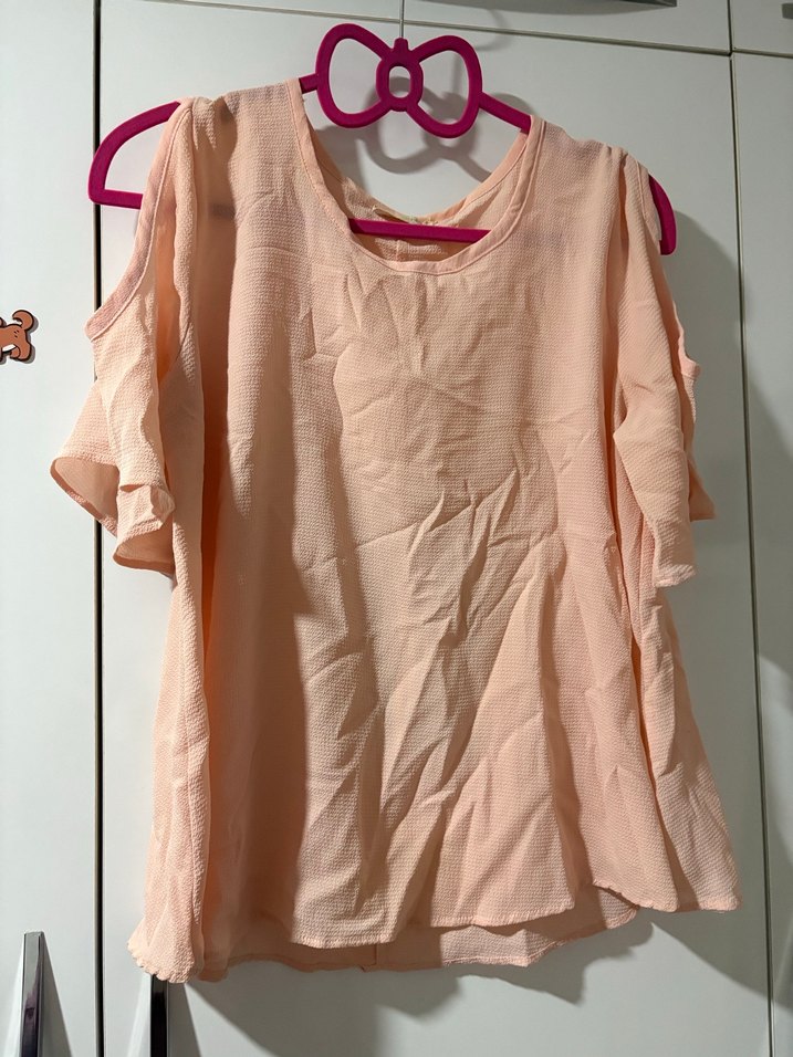 Yumuşak keten kumaştan, pembe renkli, kısa ve drapeli kollu, straplez yakalı salaş kesim bluz. Günlük rahat sokak stili için uygun.