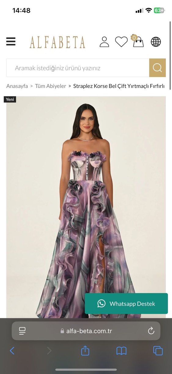 Uzun ve vücuda oturan bu abiye, straplez yaka ve ince askılarla tasarlanmıştır. Pastel mor tie-dye desene, fırfır detayları ve çift yırtmaç içerir. Hiç giyemedim doğumdan önce almıştım olmadığı için satıyorum. Satılık olan rengi turunculu olan 3.görseldeki resmidir