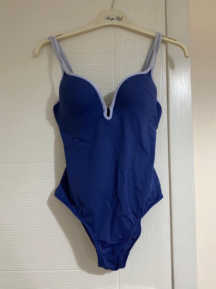 Straplez askılı, v yaka, lacivert renkli, normal boy mayo. Streetwear ve athleisure tarzını bir araya getirir.