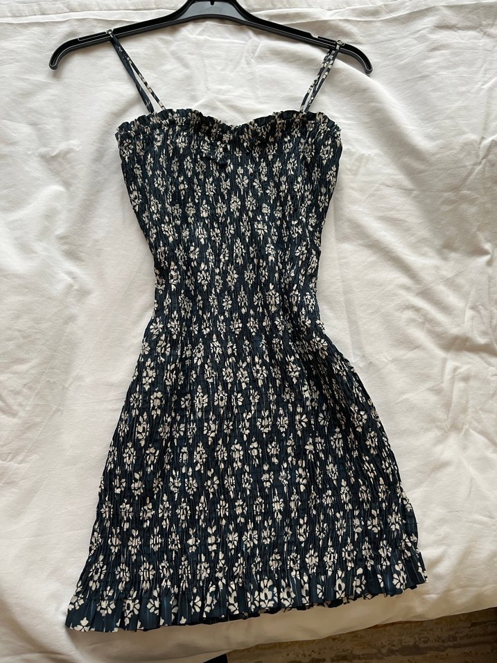 Lacivert renkli, ince askılı straplez midi elbise. Pilili ve fitted kesim, koyu tie-dye desenli, sentetik yumuşak kumaştan üretilmiştir.