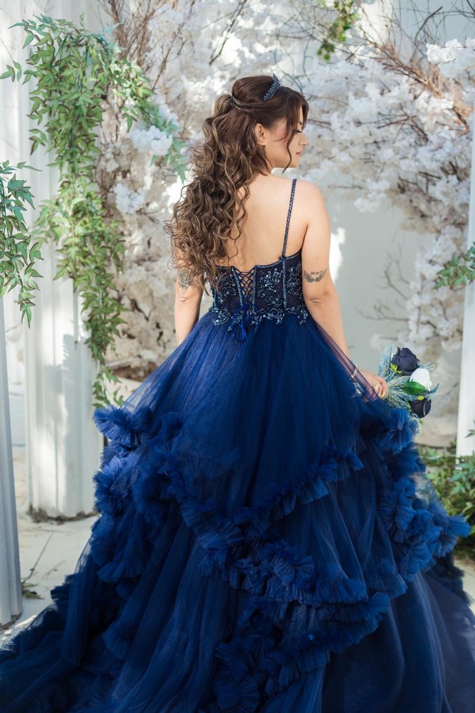 Lacivert ince askılı nişan elbisesi nakışlı detaylar ve fırfırlı katmanlara sahiptir. Sırtı bağcıklı, askılı, uzun ve oturan kesimdir. Gotik ve klasik şıklığı bir arada sunar.Beden olarak arkası bağlamalı olduğu için 36 - 40 arası olur.