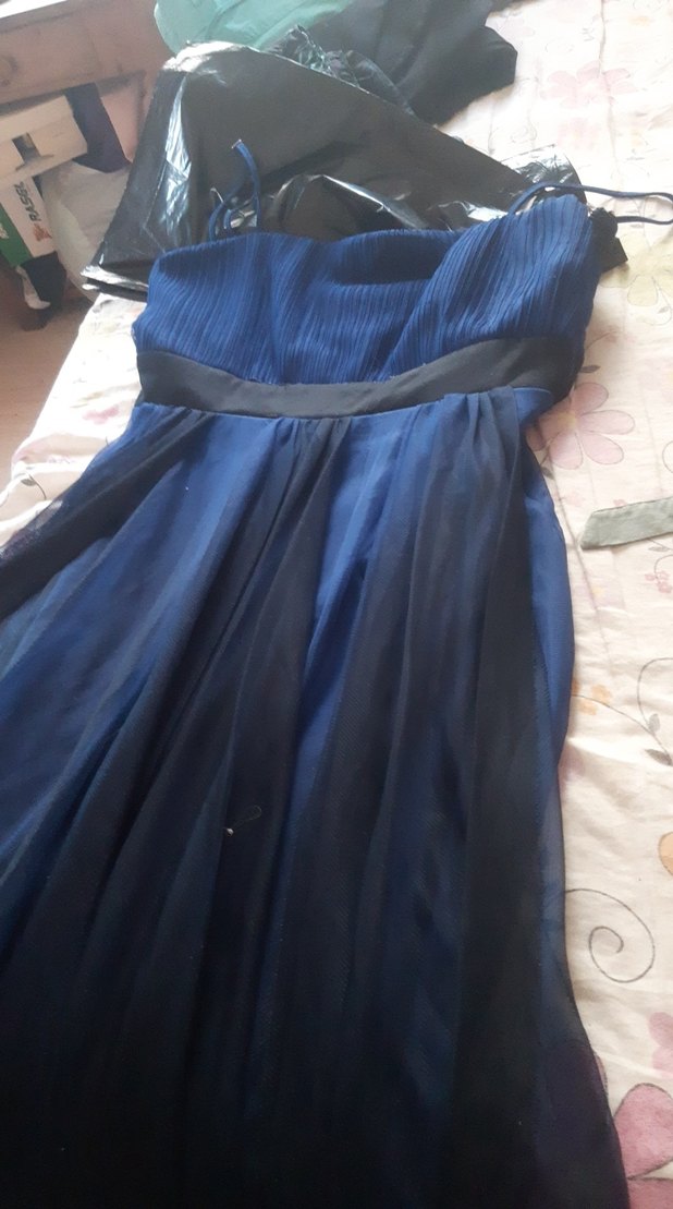 Fitted ve kolsuz, straplez yakalı, lacivert uzun abiye elbise. Pilili tasarımı ve desen içermeyen yapısıyla özel günlere uygun.