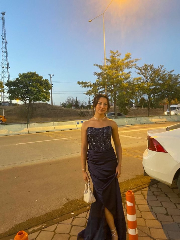 Straplez Lacivert Uzun Drapeli Abiye Elbise